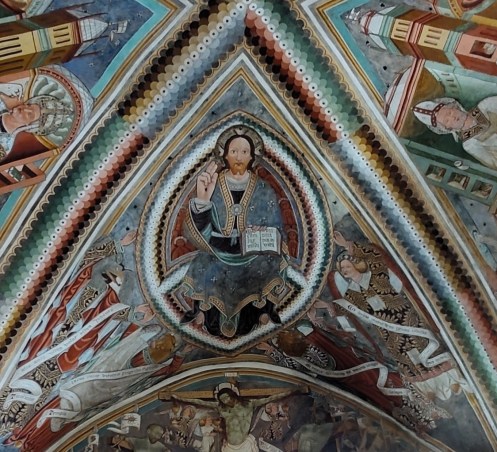 Nella volta a crociera, sopra la Crocifissione Cristo benedicente in gloria con i simboli degli evangelisti, in un ovale sorretto da quattro arcangeli.