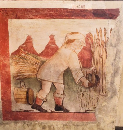 Appoggiata al pavimento, anch’esso restaurato per impedire infiltrazioni, scorre sui tre lati l’allegoria dei mesi da gennaio a novembre. Il mese di dicembre è stato evidentemente distrutto con l’apertura della porta che unisce la cappella con la successiva chiesa del ‘600.
