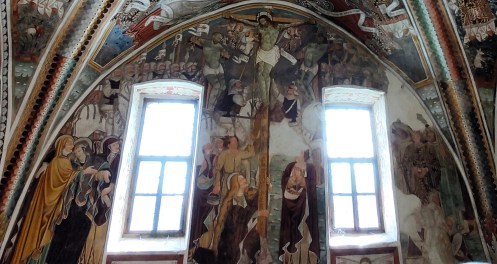 Nella parete centrale (tra e ai lati di due finestre volte ad oriente) una imponente Crocifissione.