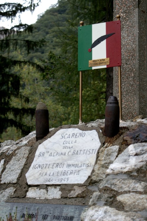 “Scareno culla della Brigata Alpina Cesare Battisti – Ignoti eroi immolatisi per la Libertà 1944-1945”. Così recita la lapide posta sulla sommità dell’Ossario di Scareno.