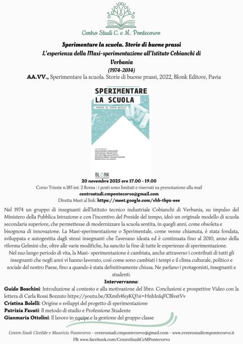 Quali autori di “Sperimentare la Scuola” siamo stati invitati dal Centro Studi Clotilde e Maurizio Pontecorvo a parlare della Maxi-sperimentazione all’Istituto Cobianchi di Verbania. L’iniziativa si è svolta presso la sede di Roma del Centro Studi il 20 novembre scorso. Differentemente da Guido Boschini e Patrizia Favati, presenti in loco, vi ho partecipato da remoto. Il tema concordato del mio contributo è stato quello del rapporto fra l’Equipe del Consiglio di Classe e il corrispondente gruppo classe. Allego la locandina dell’iniziativa.