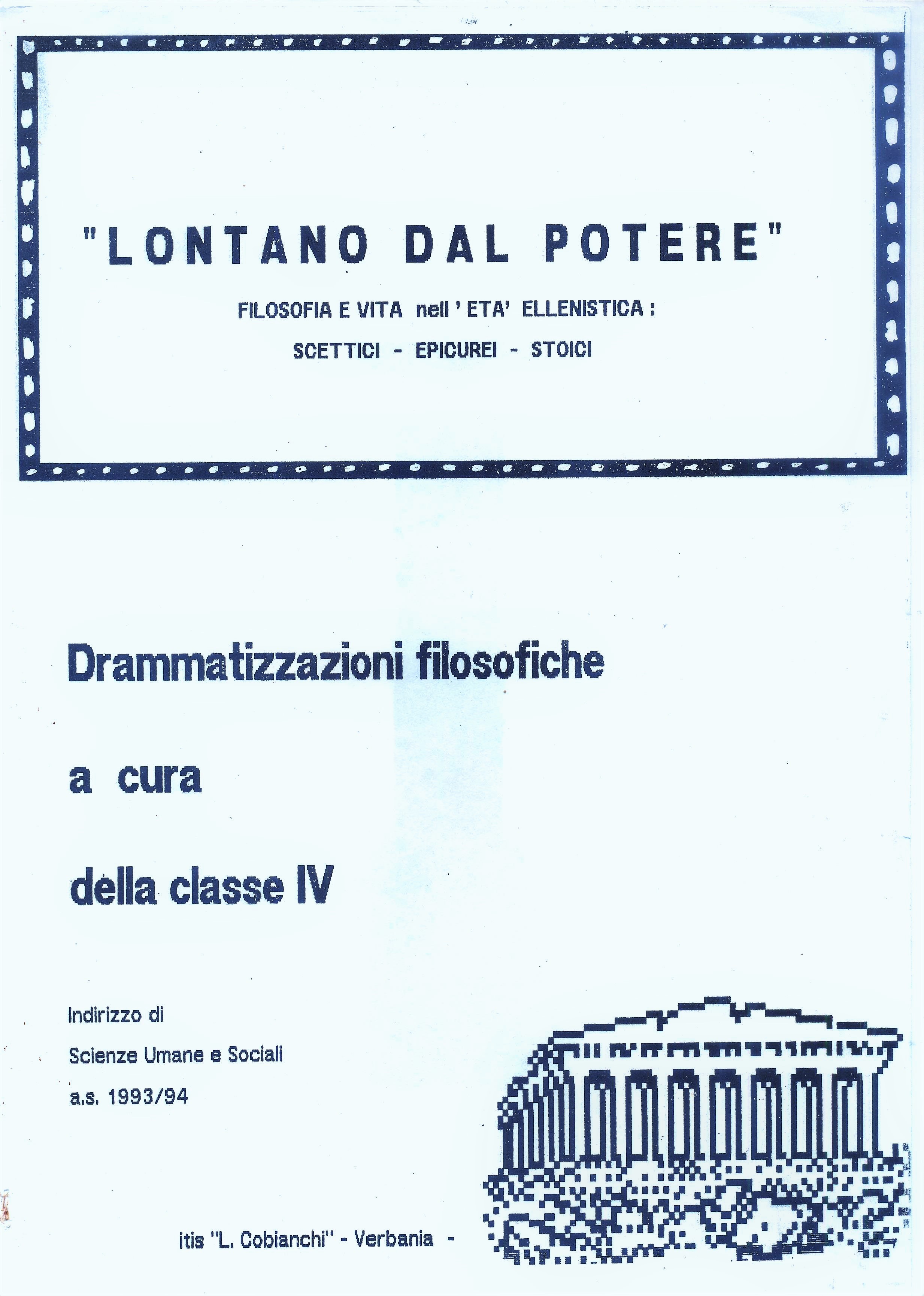 “Quando in seguito al test di autovalutazione si è deciso (a nostra insaputa) di affrontare gli argomenti riguardanti la filosofia ellenistica tramite drammatizzazione, le reazioni della classe sono state un po’ di perplessità. Questo significava una quantità di lavoro relativamente grande, da svolgere in tempi ristretti. Come sappiamo però l’esito si è rivelato un successo per noi [(4 nomination!)] sia dal punto di vista didattico che dal punto di vista umano. Siamo riusciti ad integrare diversi strumenti di studio (testi scolastici, enciclopedia, computer) e a ottenere un prodotto finito originale e completo. Le successive rappresentazioni e mostre (nella nostra scuola e Stage a Reggio Emilia) hanno fatto in modo che noi acquisissimo un’esperienza ed autonomia in grado di garantirci un migliore approccio al mondo lavorativo”.