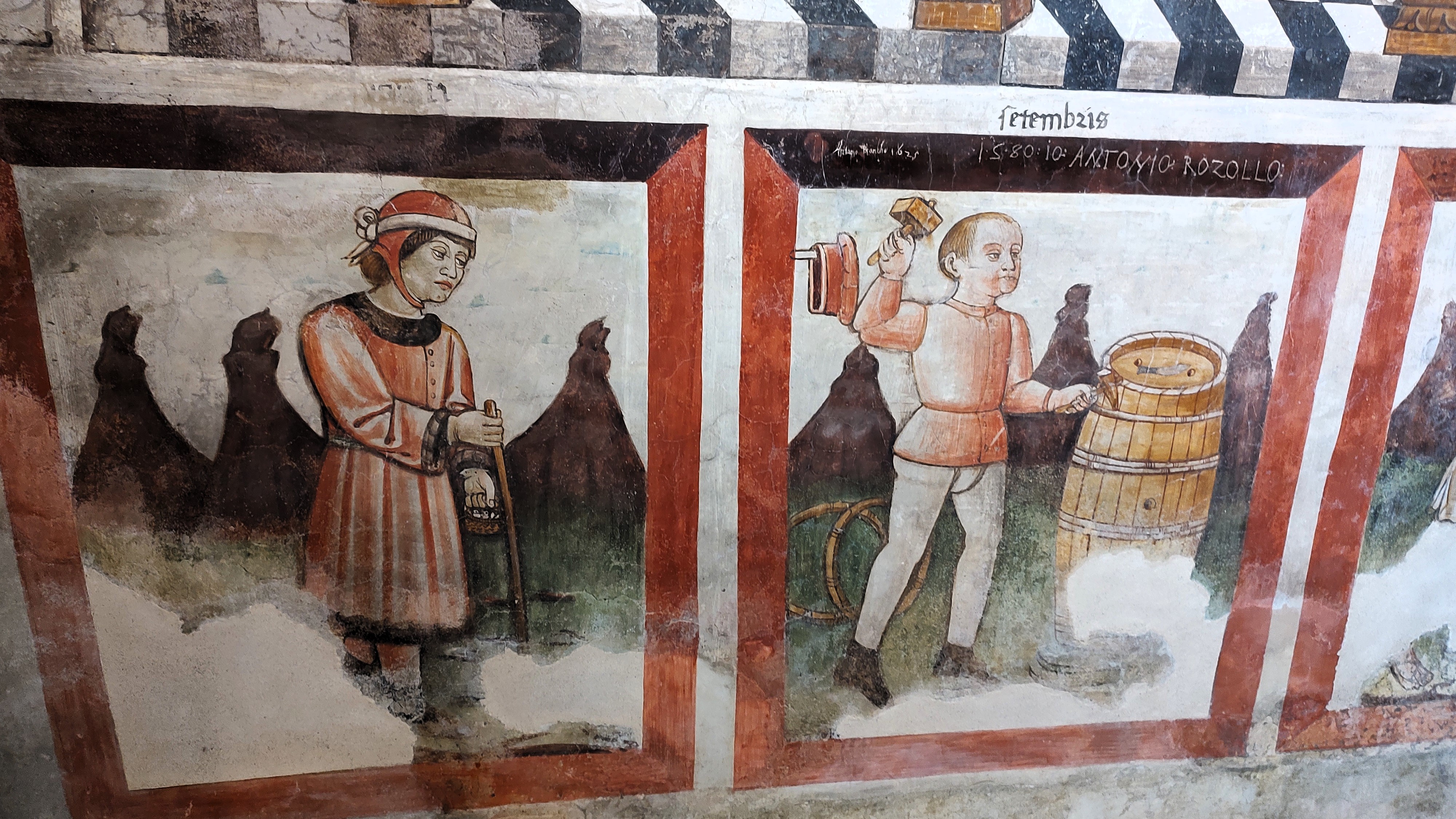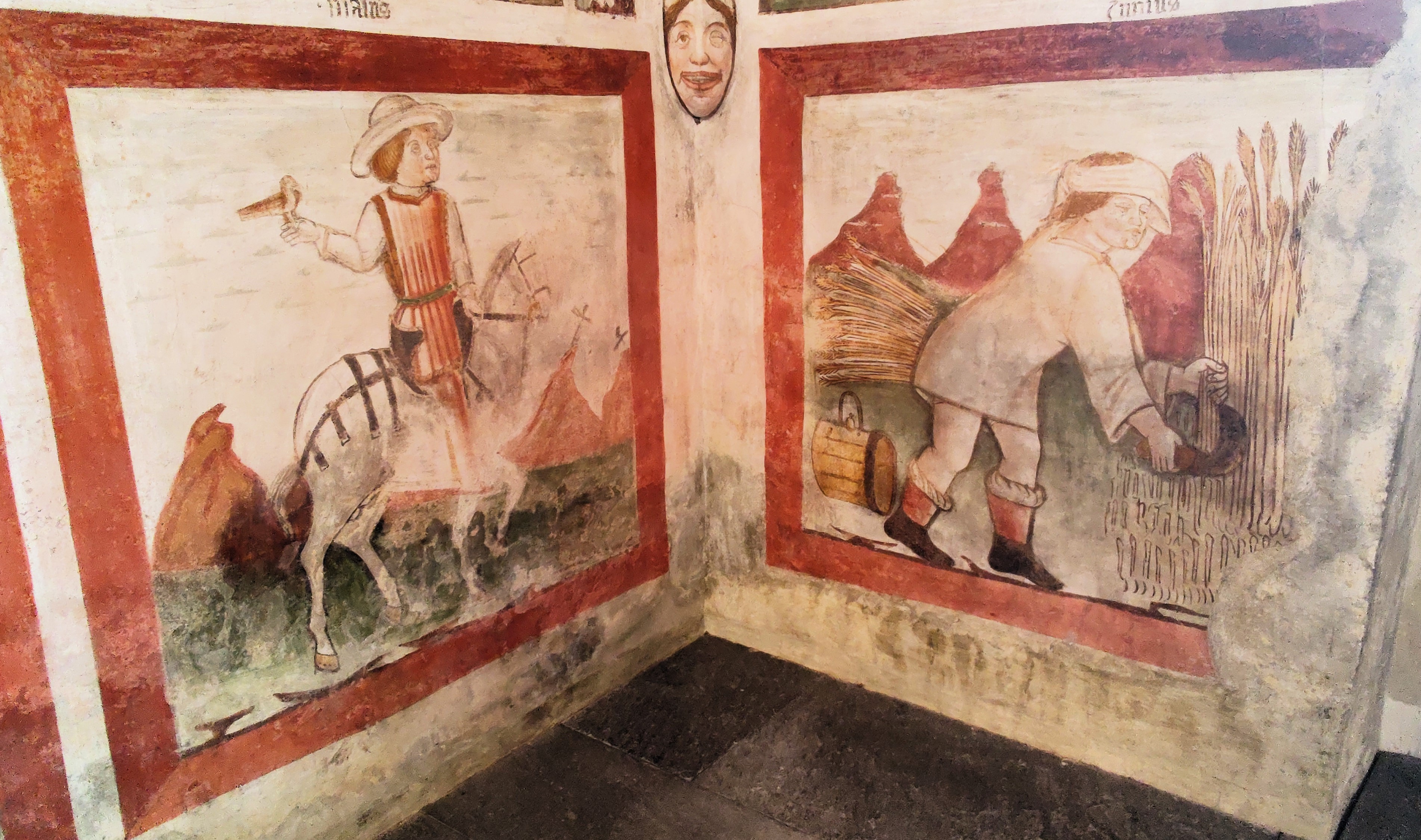 Appoggiata al pavimento, anch’esso restaurato per impedire infiltrazioni, scorre sui tre lati l’allegoria dei mesi da gennaio a novembre. Il mese di dicembre è stato evidentemente distrutto con l’apertura della porta che unisce la cappella con la successiva chiesa del ‘600.