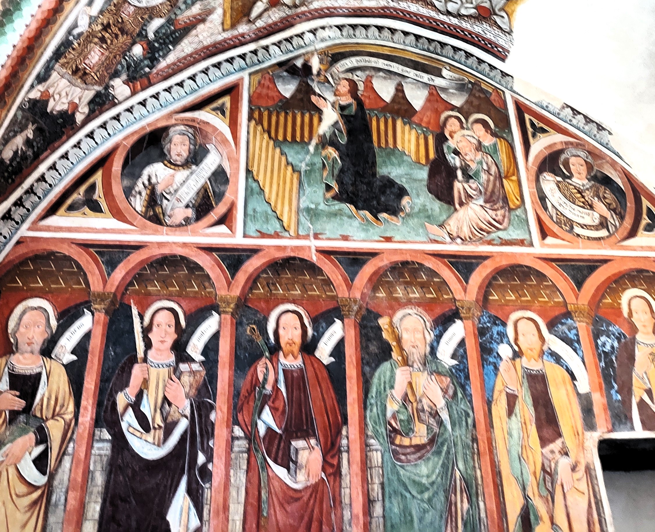 Se nel dettaglio questi sono i ricchi contenuti della pur piccola cappella, non va evidentemente perso l’insieme della scenografia che risale dallo scorrere terreno dei mesi alla tradizione evangelica (gli apostoli e il Golgota) per sovrastare nella volta con il Cristo in gloria e i pilastri della dottrina, così come mirabilmente ci ha introdotti il passo iniziale di Erminio Ferrari.