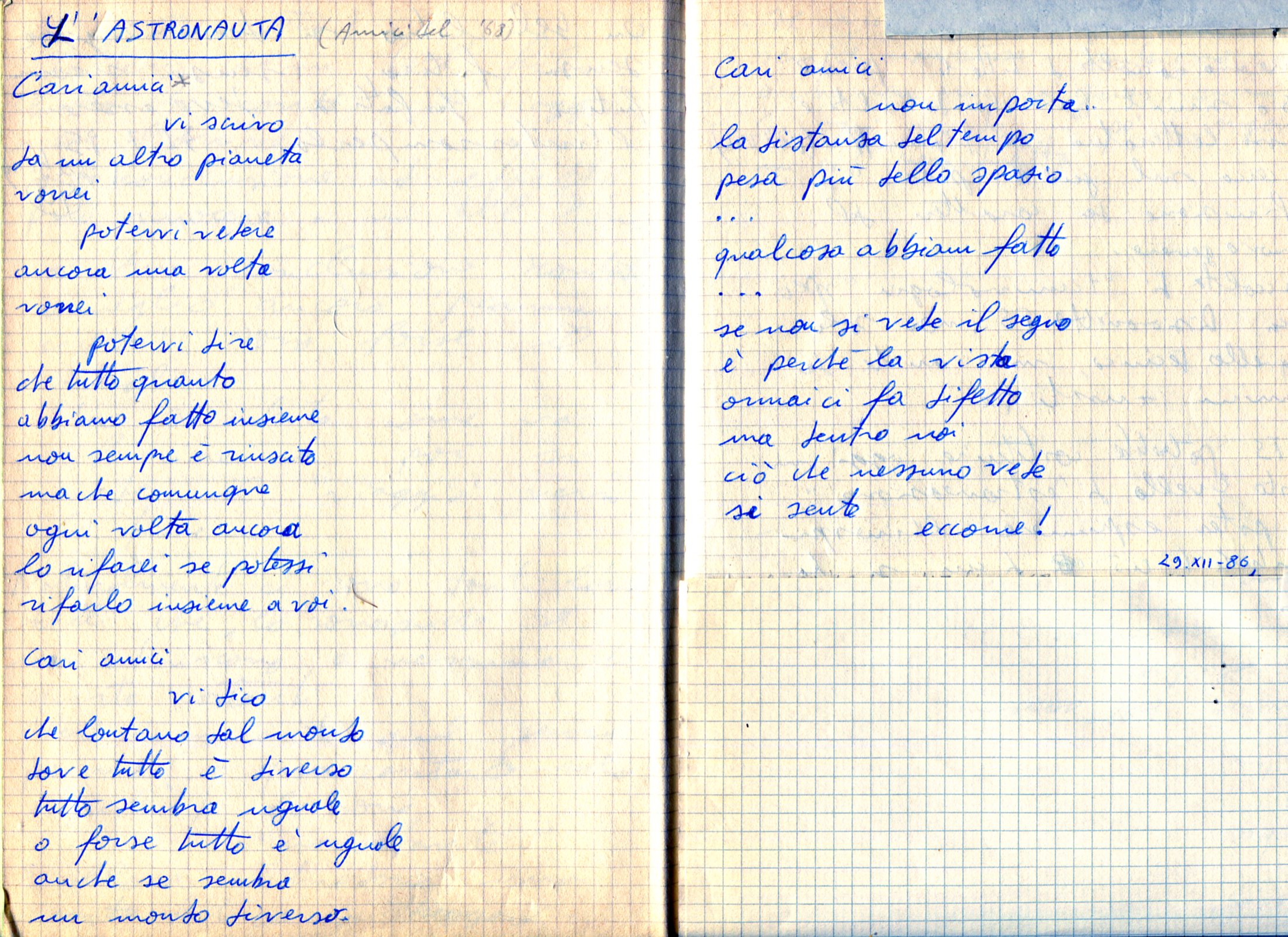Due penultime, dicevo, perché pochi anni dopo avevo scritto un piccolo poema che ho fatto leggere alla mia collega ed amica Patrizia. È stata drastica: “Non è proprio il tuo genere!”. Ho seguito il suo implicito consiglio e da allora di poesie non ne ho scritte più.