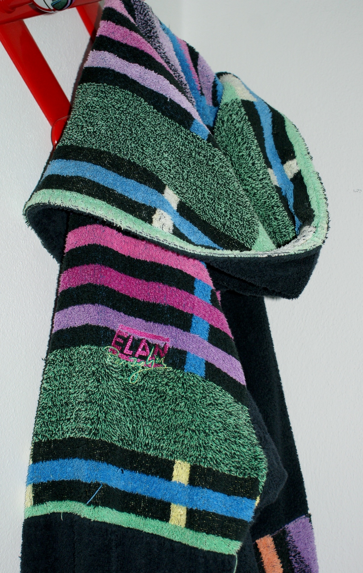 Nell’estate 1985 eravamo in Slovenia (allora Jugoslavia) e in uno spaccio della Elan, la mitica marca degli sci di Stenmark, ho tra l’altro acquistato un accappatoio di spugna con i tipici e sgargianti colori a strisce su fondo nero. Ancor oggi è il mio accappatoio ed ha l’unico difetto – temo dovuto alla mia attuale stazza – di essermi diventato leggermente stretto; non penso comunque di separarmene. Dopo oltre trentacinque anni ne sono chiaramente affezionato.