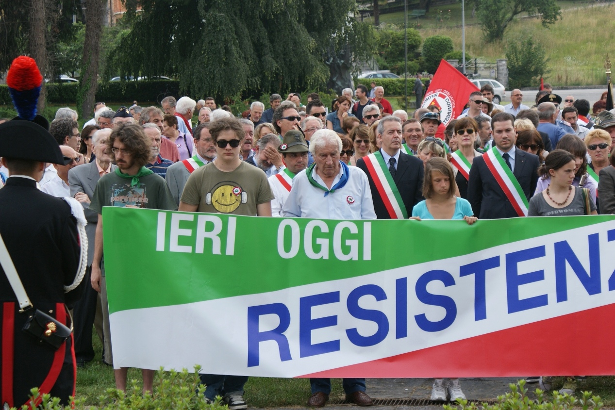 Guardando meglio tra le foto più recenti ho poi trovato le ultime due, relative alla precedente commemorazione di Fondotoce. Vittorio è fra il pubblico, semi-nascosto dietro lo striscione “Ieri oggi Resistenza sempre” sorretto da giovani e partigiani.