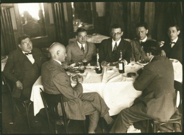 Israel Joshua Singer (secondo da sinistra, di profilo) in un caffè in Polonia assieme ad altri scrittori yiddish nel 1930