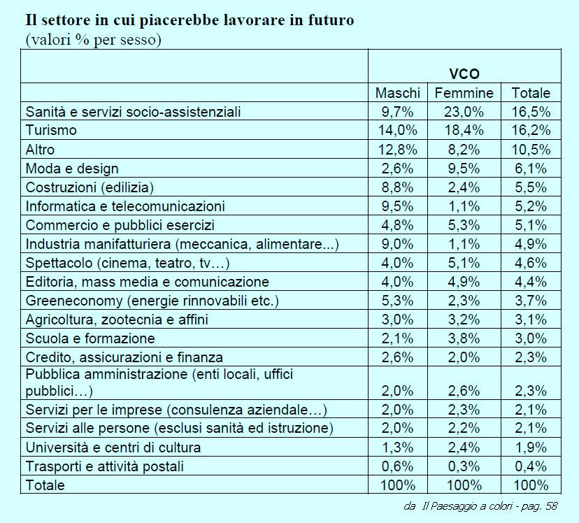 Se si tiene conto che gli addetti totali registrati nelle imprese del VCO al giugno 2013 sono 42.301, i settori decisamente sottostimati dai giovani sono quelli dell’Industria (addetti 23,4%; attese 4,9 %), del Commercio (addetti 20,5%; attese 5,1%) e delle Costruzioni (addetti 12,3%; attese 5,5%). Decisamente più allineati alla realtà attuale l’orientamento al lavoro per il Turismo (addetti 16,1%; attese 16,1) e in parte per l’Agricoltura (addetti 2,4%; attese 3,1%). Sembrerebbero invece significativamente privilegiati (e sovrastimati) dai giovani sia il settore Socio Sanitario e Formativo (addetti 4,2%; attese 21,4%) [2] che quelli delle Attività ricreative, artistiche e culturali (addetti 3,9%; attese 9 %) e dell’Informatica e telecomunicazioni (addetti 1,5%; attese 5,2%).