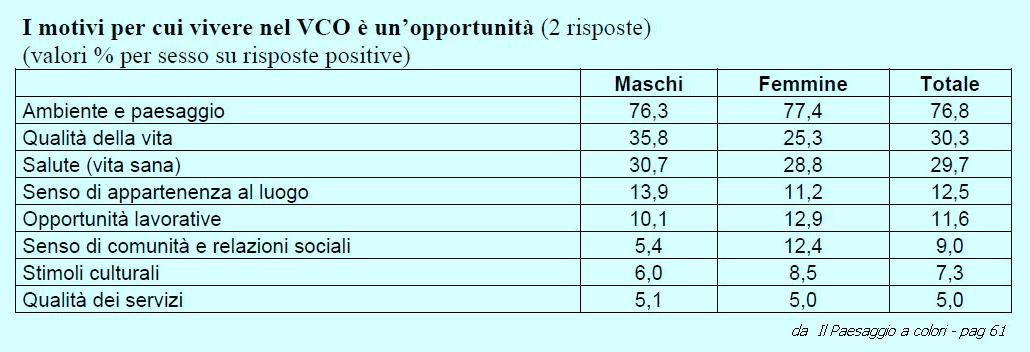 Per i restanti giovani (45,7%) che invece ritengono che vivere nel VCO costituisca un’opportunità i motivi principali stanno nell’ambiente e nel paesaggio, nella qualità della vita, in un ambiente salubre; solo per l’11,6% di costoro  (e pertanto il 5,3% del totale) l’opportunità è costituita dalle possibilità lavorative.