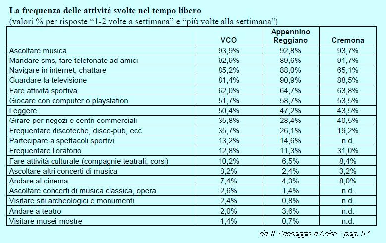 Il quadro che emerge sui giovani locali non differisce da quello nazionale e, in particolare, da zone consimili. Se si analizzano le attività durante il tempo libero emerge lo spaccato di una gioventù dinamica, con interessi distribuiti ad ampio raggio, dal divertimento in senso lato, alle relazioni amicali, all’uso frequente di dispositivi mediali, alle attività sportive e con un interesse forte, superiore a contesti analoghi, per le attività più propriamente culturali. Per esempio oltre la metà (50,4%) dedica parte del proprio tempo a leggere almeno una volta a settimana, percentuale superiore ad es. ai giovani di Cremona (43,5%). Fra gli interessi prevale su tutti quello musicale (Ascoltare musica: 93,9%).