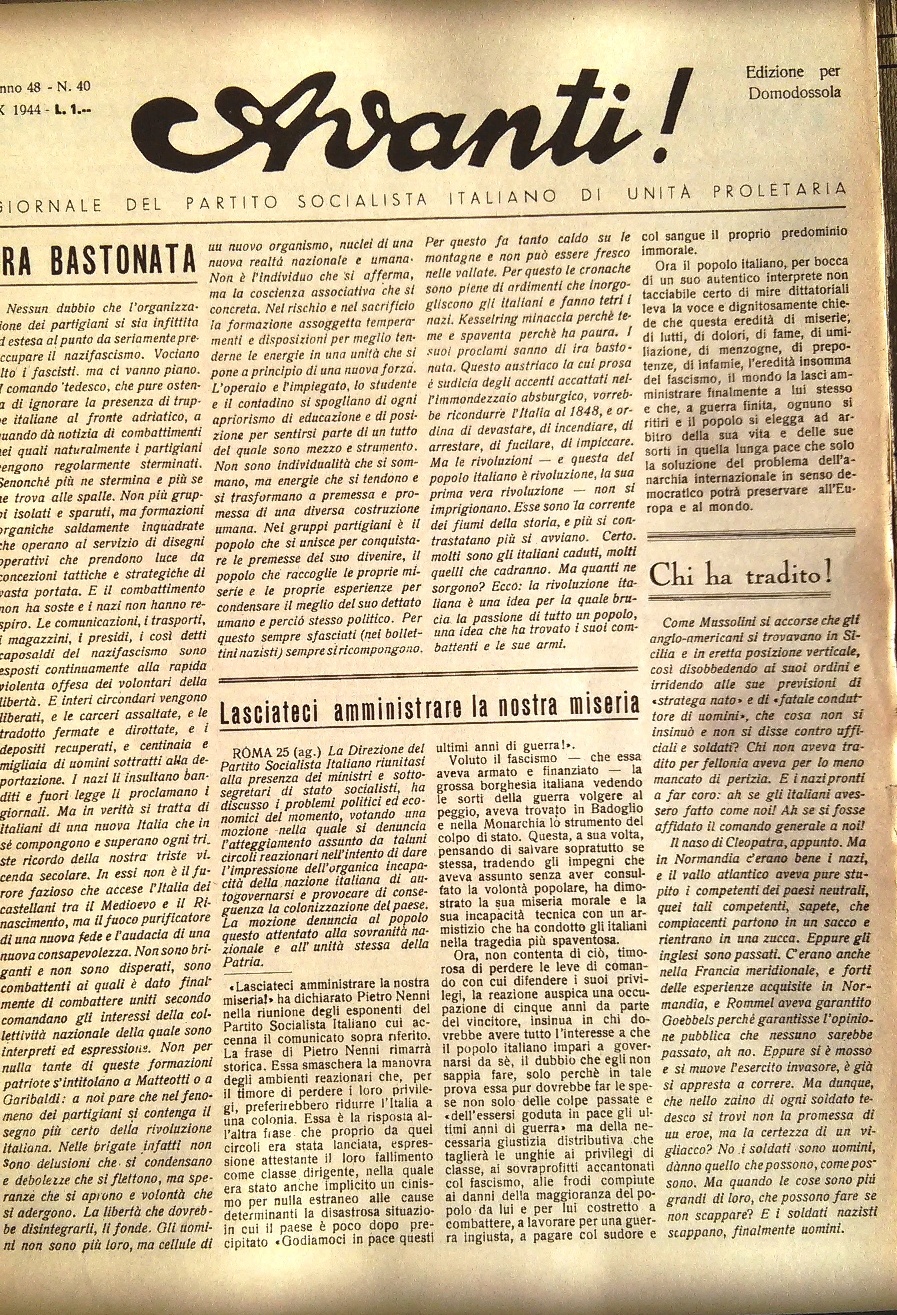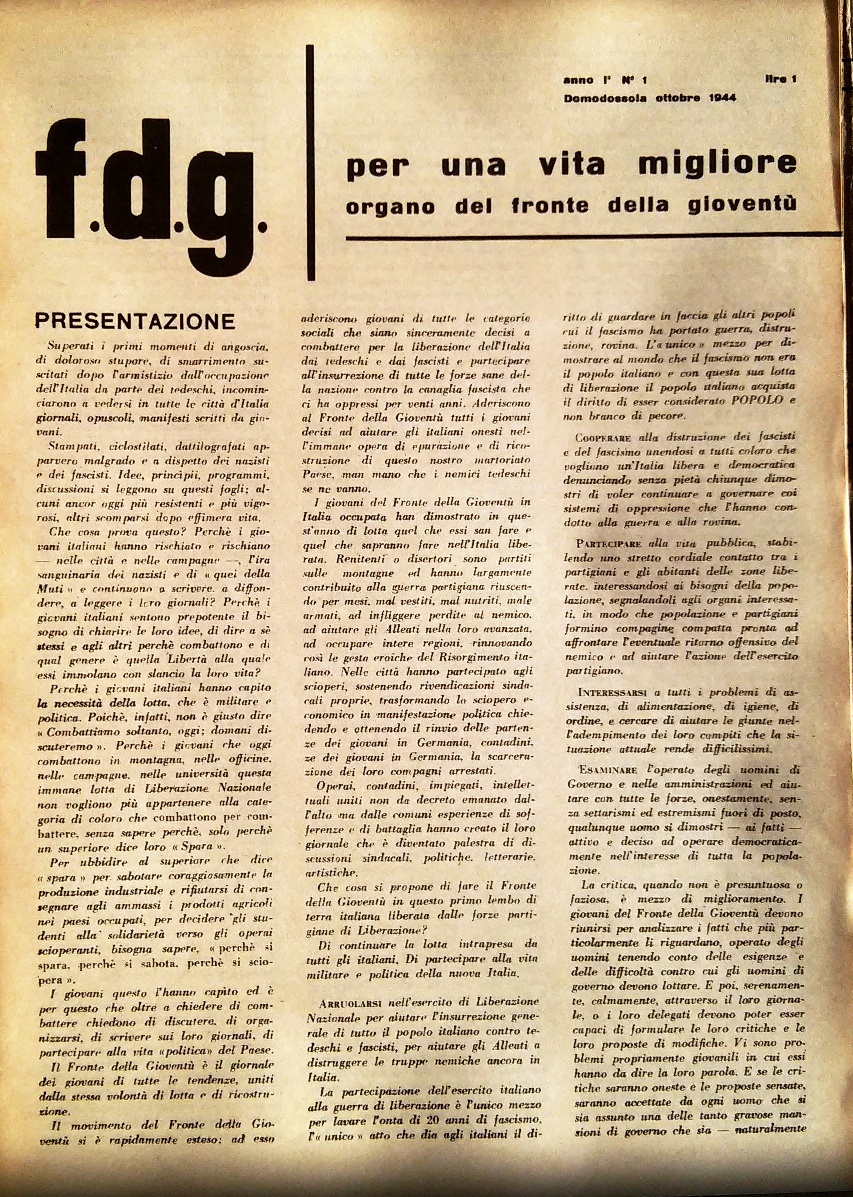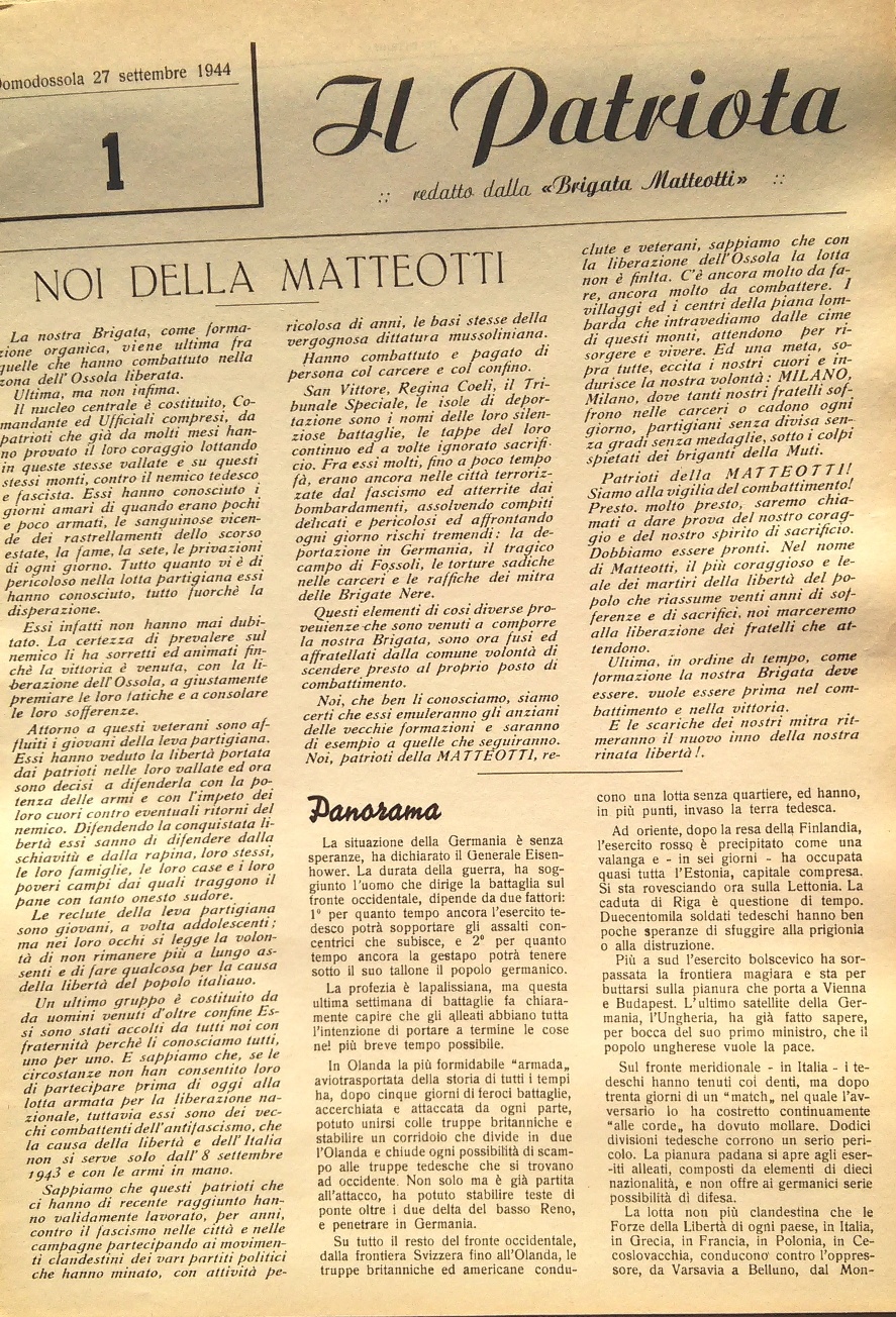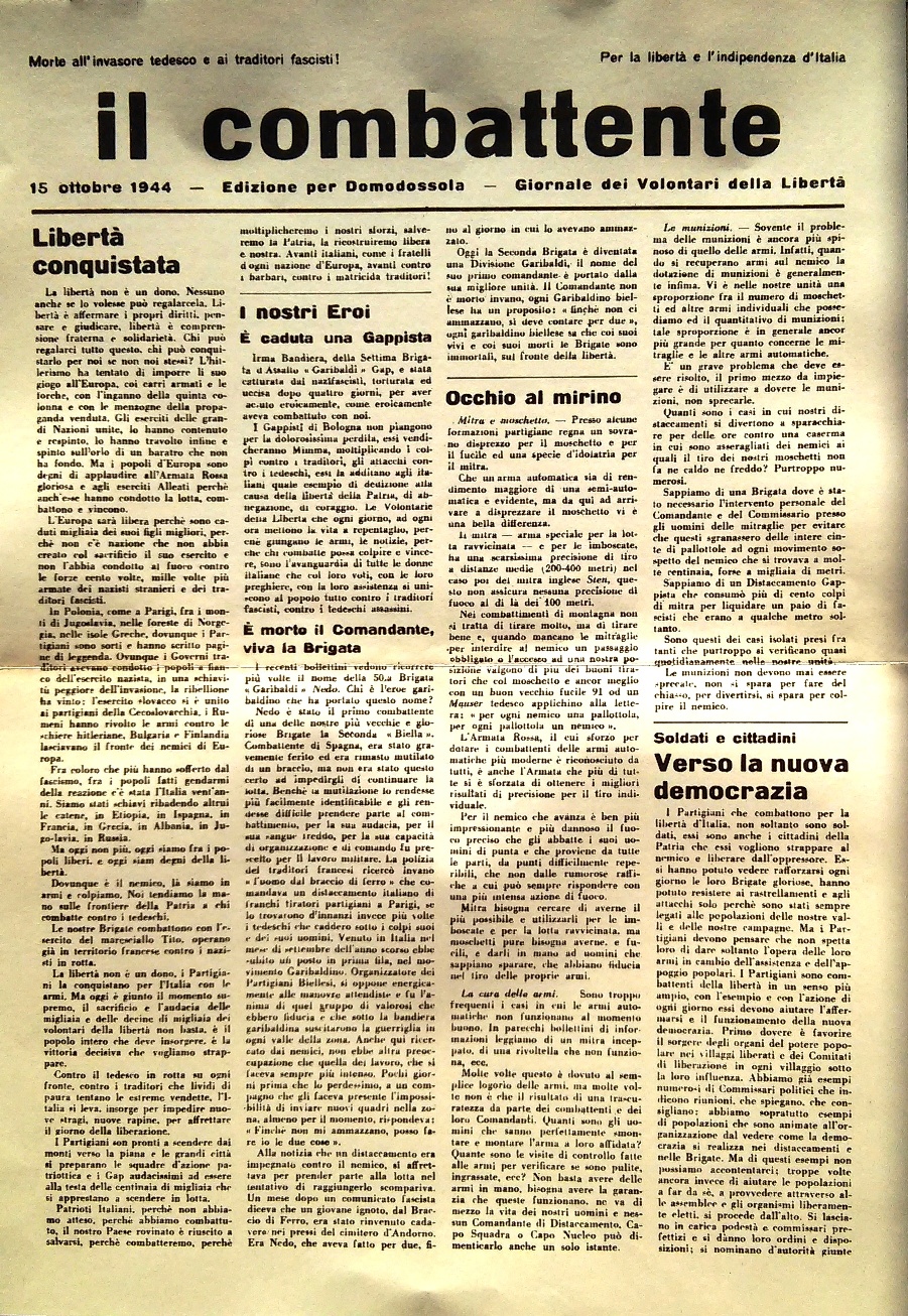 - Il clima di partecipazione entusiastica, di fervore democratico, di attività culturali, di dibattiti a tutto campo, che coinvolse i cittadini residenti, un numero consistente di antifascisti rientrati dall’esilio o affluiti dall’Italia occupata (in particolare dal novarese e dal milanese). L’elenco di politici (parlamentari, costituenti, sindaci ecc.), di scrittori, intellettuali, giornalisti, storici ecc., presenti in quei giorni in Ossola, e che poi ebbero un ruolo importante nell’Italia del dopoguerra, è lunghissimo e rischierebbe di rimanere incompleto. Fu quella una fucina di intelligenza e di libera espressione, un “clima” che ha lasciato il segno e che in molti hanno testimoniato. A me vengono in mente le bellissime pagine di Franco Fortini in “Sere in Valdossola”.Vi fu la pubblicazione di un numero consistente di testate giornalistiche, di volantini e manifesti che si aggiunsero ai comunicati e ai notiziari della GPG. Mario Bonfantini diede vita ai corsi di una “Università popolare” sulla storia contemporanea. E, in sincrona a tutto questo, la partecipazione attiva dei cittadini alle esigenze sia militari (costruzione di armi e munizioni nelle fabbriche) che civili (ad esempio gli allievi e gli insegnanti del Rosmini che aiutarono ad accumulare e ridistribuire le derrate – patate, latte condensato, … – e i medicinali provenienti dalla Svizzera utilizzando il sottotetto del Collegio come magazzino).
