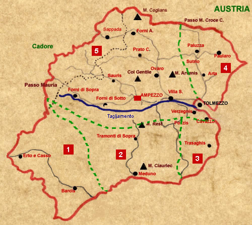 - Carnia (luglio – settembre zona libera; ma GPG 28 settembre – 10 ottobre). Fu la “Repubblica” più vasta per territorio (oltre 2.500 km2 ) comprendente ampie aree a nord e sud del Tagliamento e con una popolazione di oltre 80.000 abitanti distribuita in 40 comuni. La costituzione (28 settembre) della Giunta Provvisoria di Governo (ad Ampezzo) fu preceduta, a partire dai primi di agosto, dalla costituzione di CLN locali e provinciali tramite libere elezioni a cui partecipavano i capifamiglia, donne comprese, con una netta separazione fra potere civile e potere militare. Fra le varie disposizioni si possono ricordare la concessione di autonomia amministrativa al territorio montano e la difesa del patrimonio boschivo; la riforma scolastica, la costituzione di un Tribunale del Popolo e l’abolizione della pena di morte per reati comuni; la gratuità dell’amministrazione della giustizia; la riforma fiscale; la costituzione di un corpo di polizia civica. Particolarmente pressante il problema dei rifornimenti alimentari per la non autosufficienza del territorio e per lo stretto assedio della zona da parte nazifascista; l’assedio fu aggirato dai Gruppi di Difesa della Donna: vennero formati consistenti nuclei femminili che, a piedi, scendevano con la gerla verso la pianura sino a Meduno, dove il servizio di intendenza partigiano le trasportava verso la costa dove potevano rifornirsi di grano e altri generi alimentari.