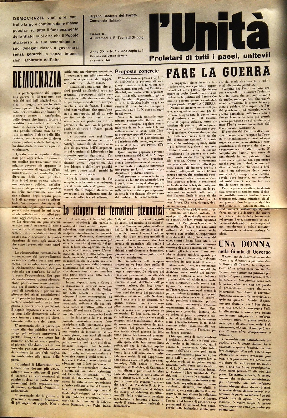 Quell’estate – autunno di settant’anni fa fu giustamente definita come l’epoca della libertà ritrovata: fu in molte parti dell’Italia occupata il tempo in cui si espresse una volontà alta di partecipazione, di sperimentazione di organismi democratici, di nascita e diffusione di molteplici organi di stampa libera. Non solo si introdusse in molti casi il principio fondante di ogni democrazia della divisione dei poteri, ma anche il loro articolarsi e moltiplicarsi: partiti, sindacati, organizzazioni di massa, assemblee, gruppi di azione civile in un fiorire di iniziative che, come osservato per l’Ossola, desta stupore per la capacità di iniziativa concreta che, in poche settimane e in situazioni del tutto avverse, quelle esperienze riuscirono a concretizzare da un lato e a prefigurare dall’altro. In molti di quei casi si forgiò una nuova classe dirigente che sarà quella che ci portò alla Repubblica e alla Costituzione. Il tutto all’interno di un dibattito vivacissimo, con posizioni politiche estremamente differenziate ma con una capacità di ascolto reciproco e di “mediazione alta” di cui oggi abbiam perso memoria.