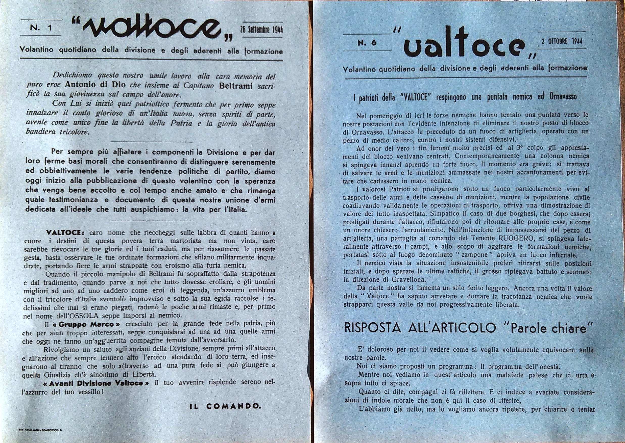 Un piccolo episodio per ricordare quel clima di partecipazione, ma anche di confronto acceso: la carta di quei bollettini e giornali era per i più quella bianca con due eccezioni: l’azzurro di “Valtoce” che richiamava evidentemente il colore della formazione, e il “rosso” (in realtà più rosa-violaceo) del “Bollettino quotidiano” della Giunta. Quest’ultimo colore (sembra in realtà scelto dalla tipografia per smaltirne una scorta sovrabbondante) fu vissuto come una provocazione dai partigiani azzurri che manu militari requisirono quella carta e così il bollettino, da n. 8 del 29 settembre uscì “normalizzato” con la carta bianca.