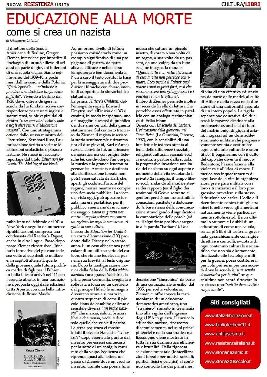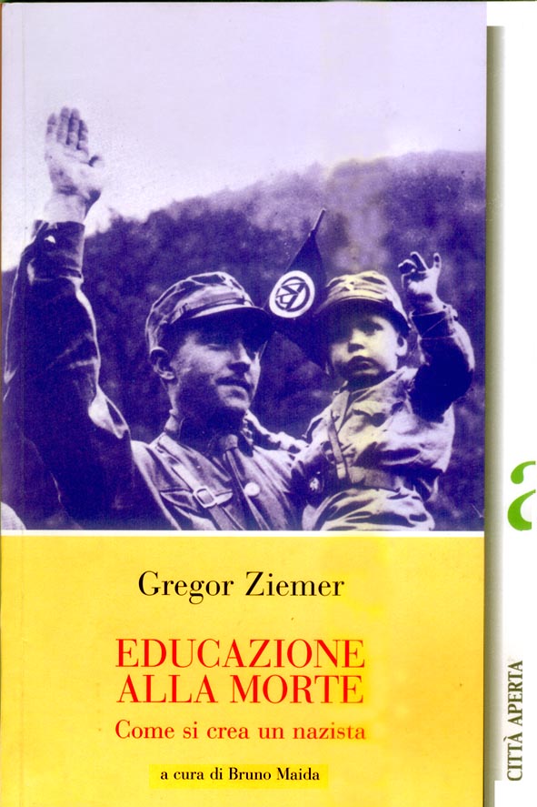 Ziemer, ci offre invece la testimonianza di un educatore democratico americano, uno “straniero” rimasto in Germania fino alla vigilia dell’ingresso degli USA in guerra. Il curricolo educativo nazista, ripercorso diacronicamente, nei suoi principi teorici e nella sua pratica realizzazione, viene mostrato in tutta la sua drammatica efficienza e brutalità. Dalla rigorosa selezione prenatale (le sterilizzazioni forzate per motivi razziali, politici, fisici e psichici) al continuo controllo fin dai primi mesi di vita di una effettiva educazione, da parte delle madri, al culto di Hitler e della razza nella direzione di una uniformità assoluta di un intero popolo. La rigida separazione educativa dei due sessi: le ragazze destinate alla procreazione, anche al di fuori del matrimonio, di giovani ariani; i ragazzi ad un duro addestramento militare che progressivamente svuota e sostituisce ogni contenuto culturale e scientifico. Il paganesimo con il culto del capo che diventa il nuovo Redentore; l’assuefazione alla violenza e all’idea di morte. Il meticoloso inquadramento di ogni fase della vita in organizzazioni pre e para militari con i loro riti iniziatici e il loro progressivo prevalere sulla stessa istituzione scolastica. L’odio e il risentimento contro tutti gli stranieri (quello verso gli americani naturalmente viene particolarmente sottolineato). E non ultimo lo stupore e i dubbi di un educatore di come una scuola, senza più libri di testo ma governata gerarchicamente con rigide direttive e controlli, svuotata di ogni contenuto culturale e scientifico che non sia direttamente finalizzato alle tecnologie utili per la guerra, possa costituire il pericolo più serio per una società dove la scuola è “una scuola democratica per la vita” se quest’ultima non saprà ritrovare in se stessa uno “spirito democratico ringiovanito”.