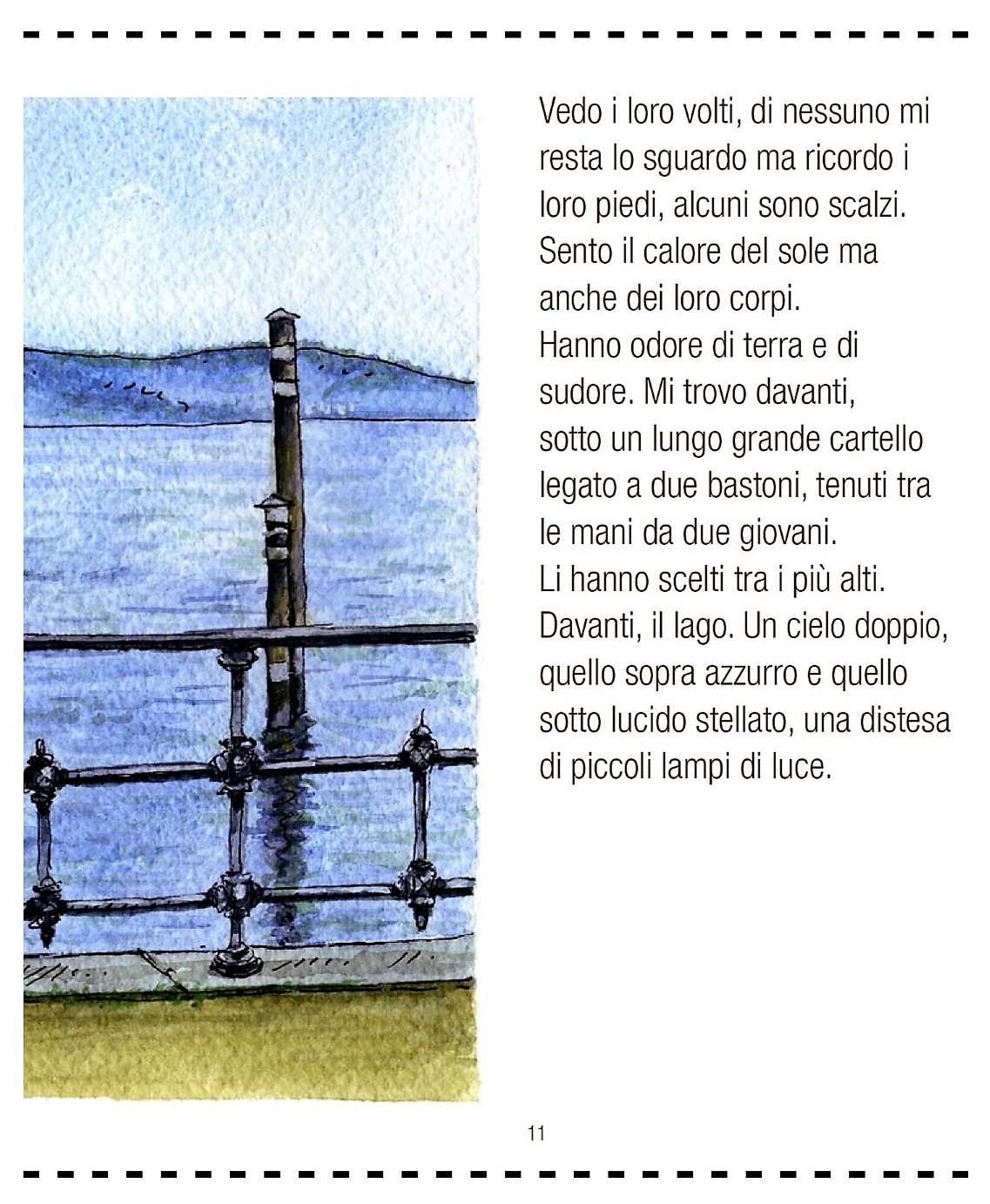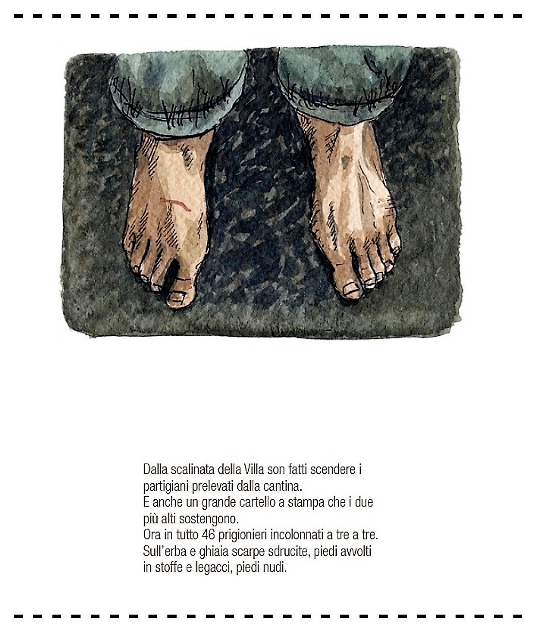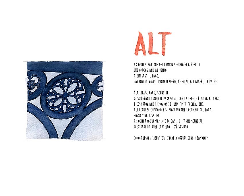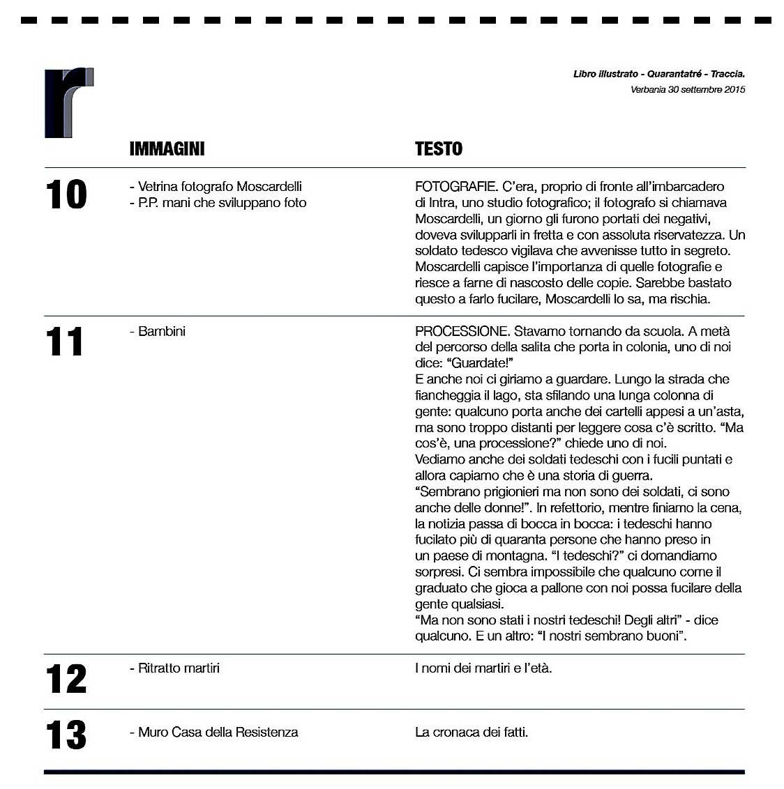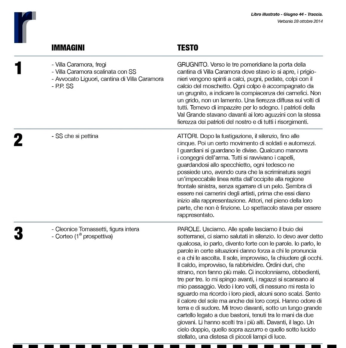 ti giro la sequenza delle illustrazioni abbinate a frammenti di testo e a parole chiave. Non ho inserito l’aneddoto di Ermanno Olmi bambino in colonia che vede sfilare il corteo. In due frammenti si fa riferimento all’orario, sicuramente è sbagliato perché si parte da Villa Caramora alle 17 e si arriva a Fondotoce alle 16.