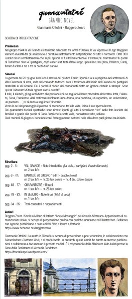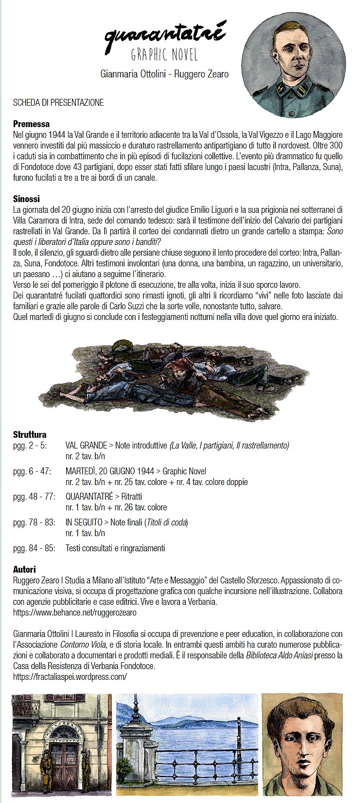 Con la presente desideriamo proporvi una graphic novel sull’eccidio di Fondotoce del 20 giugno 1944 e verificare il vostro eventuale interesse alla pubblicazione. L’opera, di cui al momento alleghiamo una sintetica Scheda di presentazione, è stata pensata sia per un pubblico nazionale, quale quello che segue le vostre edizioni, che in modo più specifico come approfondimento e ricordo per i visitatori della Casa della Resistenza e dell’area monumentale di Fondotoce. Ogni anno infatti la Casa della Resistenza accoglie circa 7-8mila tra studenti accompagnati dai loro insegnanti e gruppi organizzati dalle ANPI, in particolare dal Piemonte e dalla Lombardia.
