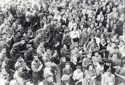 Stresa. Sotto il Municipio la folla e i partigiani ascoltano il discorso della Liberazione del Comandante “Renatino” Boeri. “Ginin” al centro della foto con la sua divisa di crocerossina