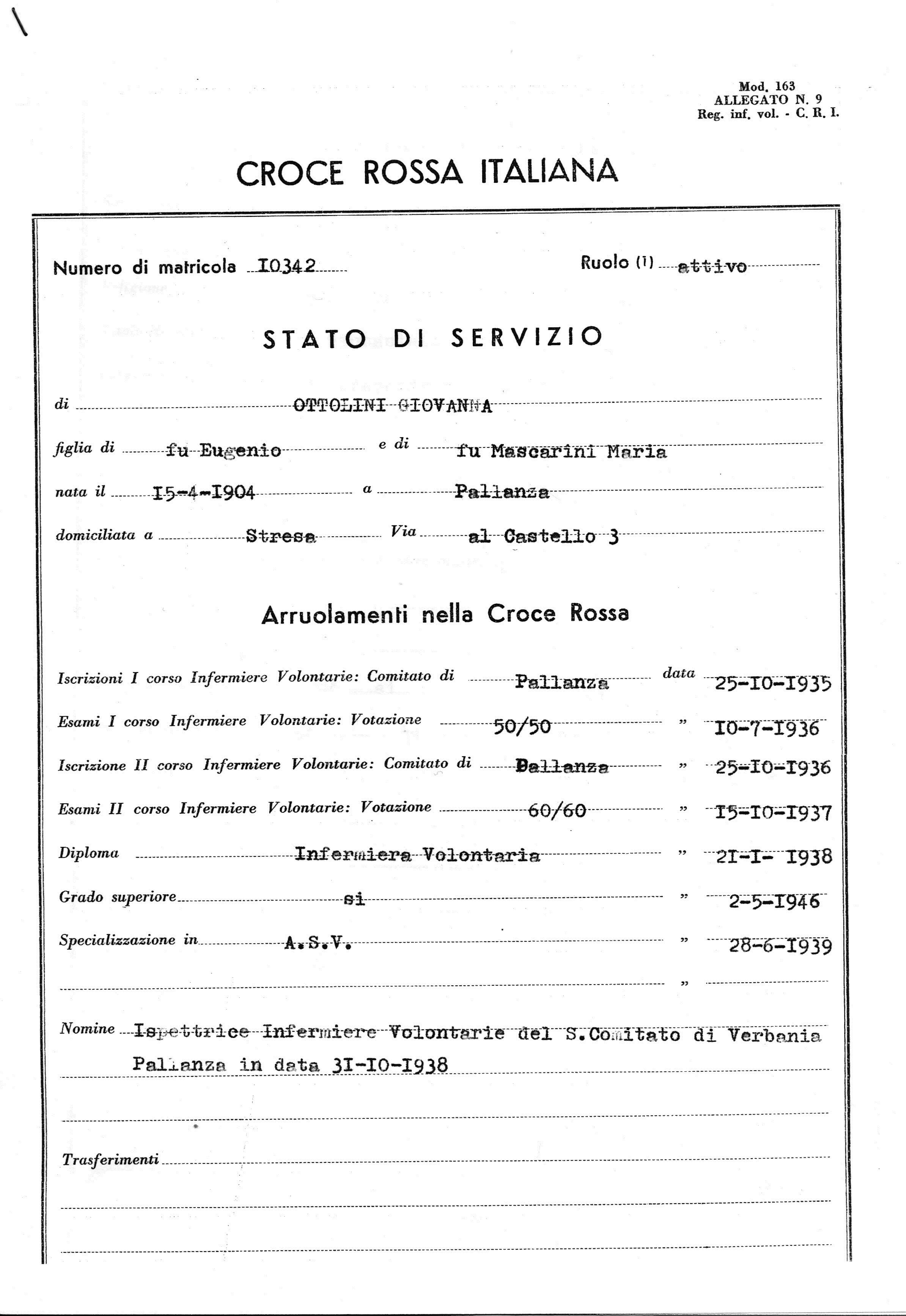 La zia era nata a Pallanza nell’aprile del 1904 e aveva studiato fino alla V Ginnasio; la sua vocazione fu poi quella di infermiera iscrivendosi pertanto al primo e al secondo corso di Infermiere della Croce Rossa ottenendo in entrambi i casi il diploma con il massimo dei voti e operando tra il 1935 e 1938 come infermiera all’Ospedale di Pallanza.