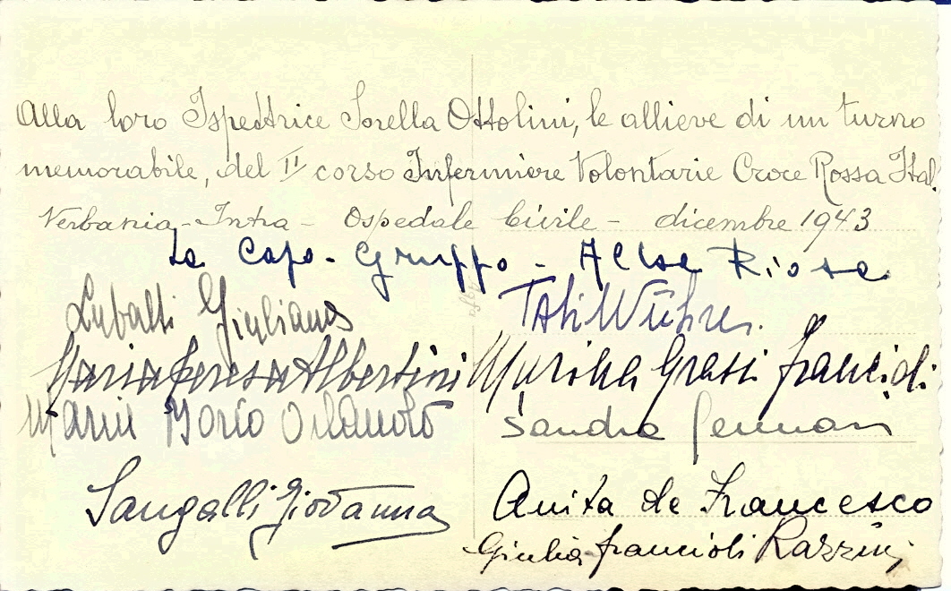A Baveno venne aperto un ospedale militare con tre sedi in alberghi requisiti: il Sempione, il Bellavista e il Lido. I feriti provenivano in particolare dal fronte greco e da quello jugoslavo. La zia fu nominata coordinatrice responsabile delle infermiere volontarie della CRI che operavano nell’ospedale militare plurisede di Baveno, dall’agosto 1941 sino al luglio 1945.