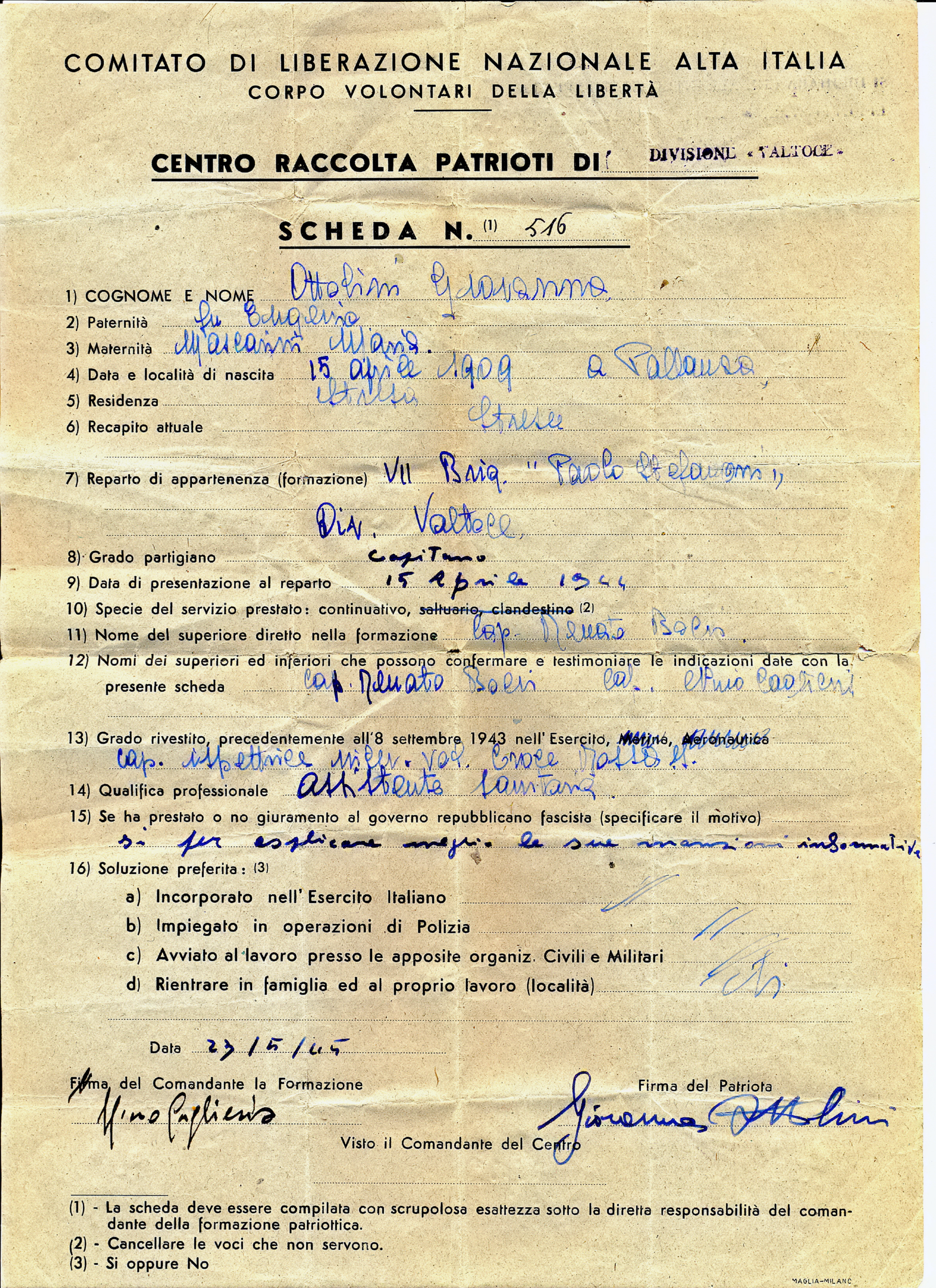 Essa è conosciuta a questo Comando come elemento attivissimo che diede tutto di sé per il raggiungimento dei compiti destinati a Lei. La VIIa Brigata, che ha il vanto di avere organizzato un servizio di informazioni che le riuscì tanto prezioso e che riscuoté il riconoscimento ed il plauso del Comando Generale e della Missione Americana dislocata in Zona Ossola, deve all’Opera instancabile e felicemente realizzatrice della Signorina Ottolini questo primato.