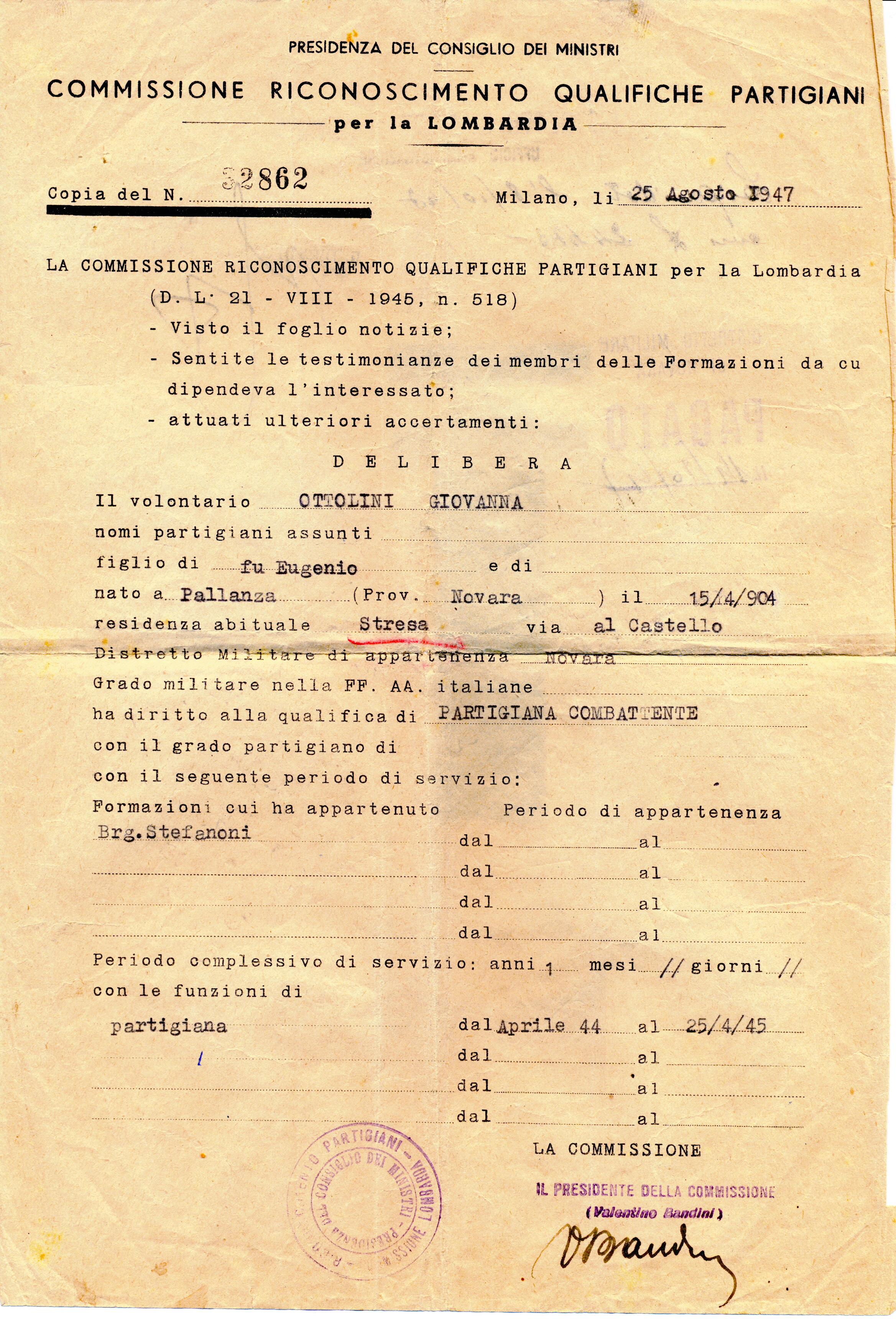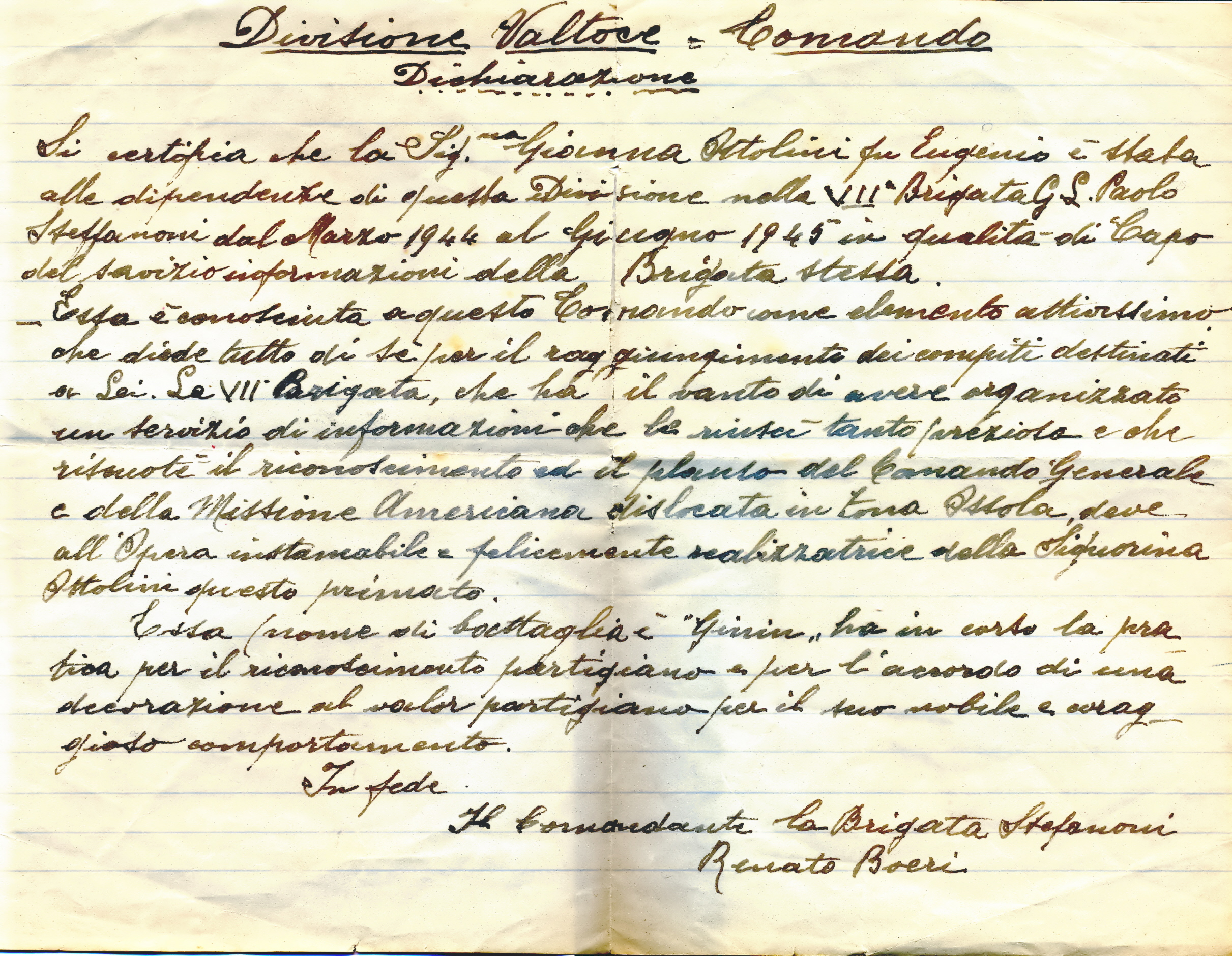 Si certifica che la Sig.na Gianna Ottolini fu Eugenio è stata alle dipendenze di questa Divisione nella VIIa Brigata G.S. Paolo Stefanoni dal Marzo 1944 al Giugno 1945 in qualità di Capo del servizio informazioni della Brigata stessa.