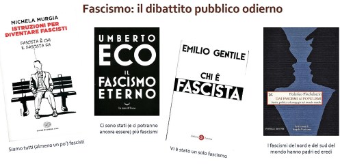 Dopo essermi raccordato alla prima lezione dell’anno precedente con esempi sulla scuola locale durante il fascismo ho poi dedicato sei slide preliminari al pubblico dibattito attuale sul fascismo per cercare di delimitarne il significato storico e politico. Riprendo in forma estesa questa parte del mio intervento.