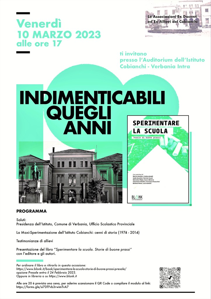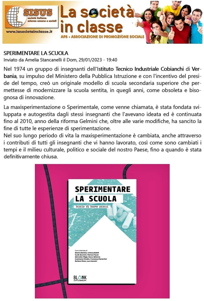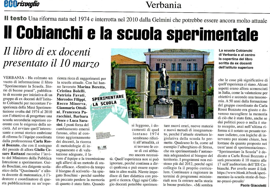 È stato pubblicato dall’editore Blônk Sperimentare la scuola. Storie di buone prassi (Pavia, gennaio 2023) curato da un gruppo di docenti di quella che fu la “Maxi-sperimentazione” dell’Istituto Lorenzo Cobianchi[i] di Verbania. Non poteva e non voleva essere la storia completa di quella esperienza quarantennale (1974 – 2014) in cui hanno lavorato più di trecento insegnanti e che ha diplomato 2256 studenti, ma la ricostruzione sintetica di alcune delle esperienze didattiche che gli autori hanno direttamente sperimentato; per non perderne memoria e come possibile stimolo a chi oggi lavora nella scuola[ii].