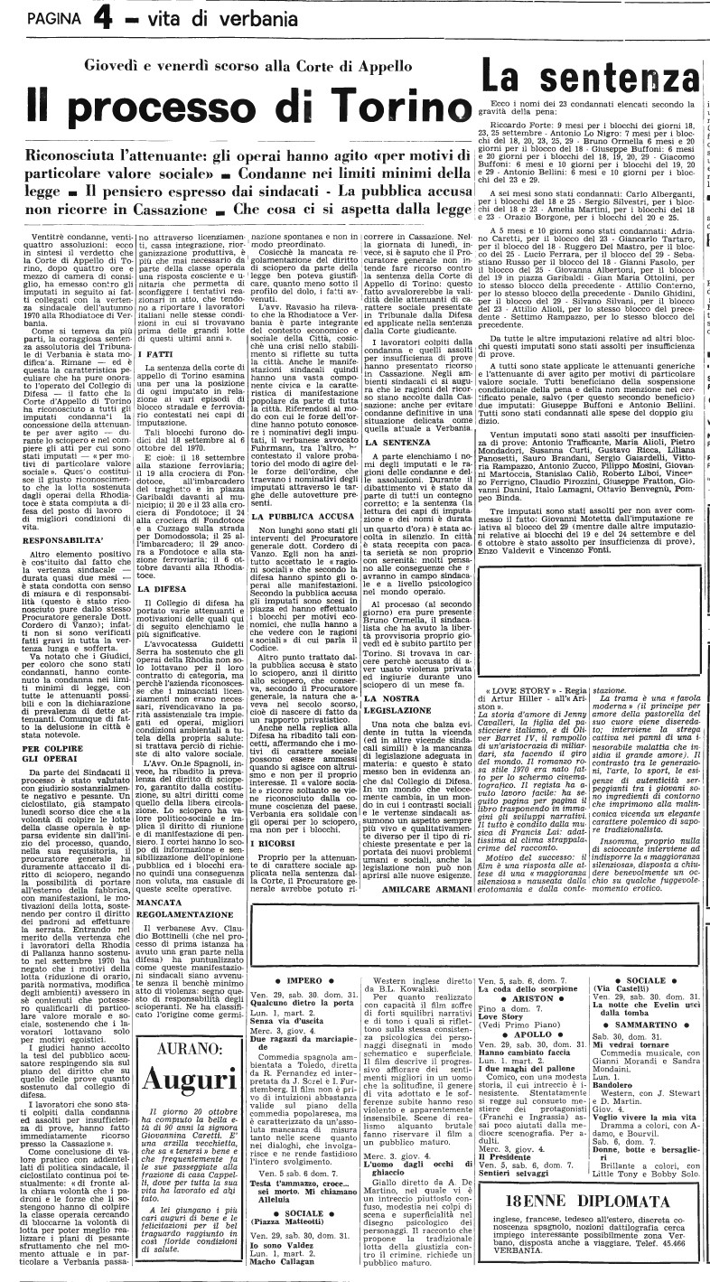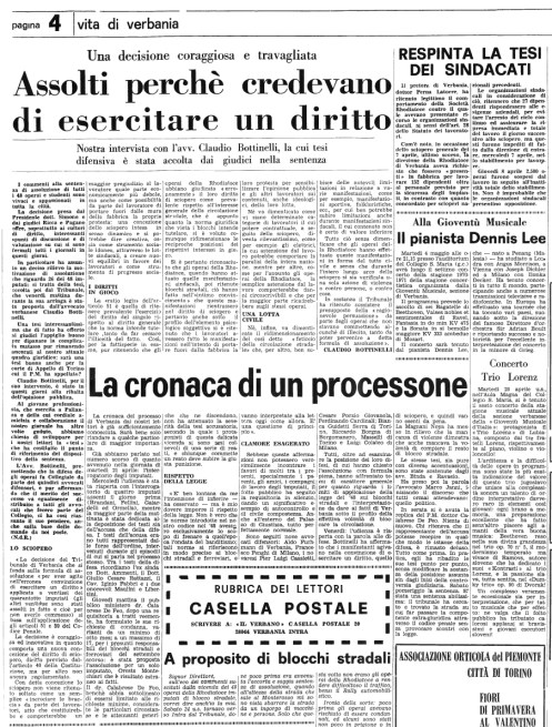 Oltre a quelle per le manifestazioni della Rhodia parallelamente e nei mesi successivi si moltiplicano nel Verbano e nell’Ossola denunce a sindacalisti, esponenti del PCI, studenti universitari per stampa clandestina, manifestazione non autorizzata, oltraggio all’ordine giudiziario ecc. [xi]