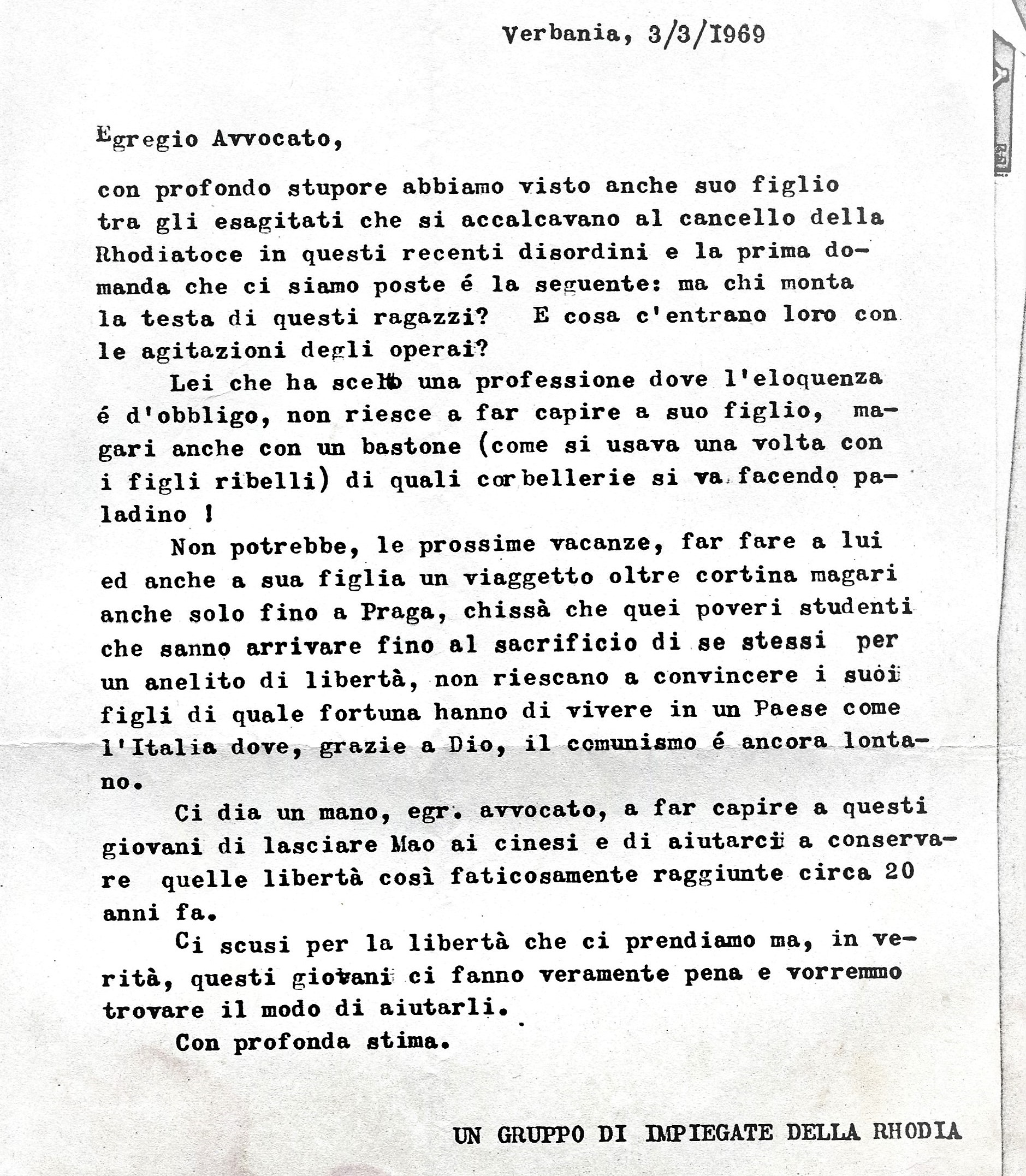 [vii] Già due giorni prima della occupazione viene mandata, evidentemente dalla direzione, una lettera anonimamente firmata “Un gruppo di impiegate della Rhodia”, in cui si invita mio padre a mettere in riga, “magari con il bastone”, il figlio (e magari anche la figlia). Presumo che lettere analoghe siano state inviate anche ad altri genitori.