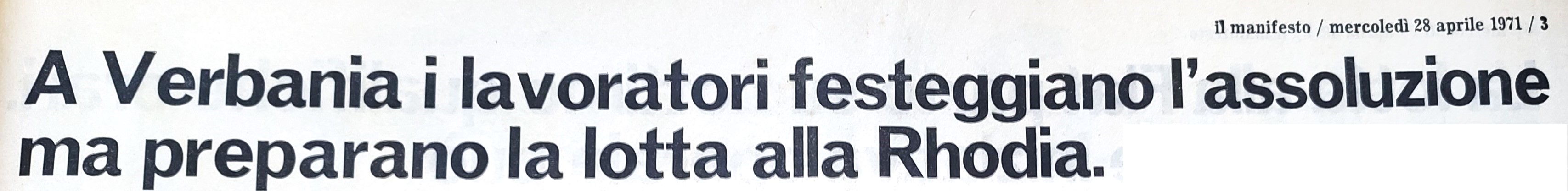 Nel precedente articolo La nascita del Gruppo de il manifesto a Verbania ricordavo come le lotte operaie e in particolare quelle della Rhodiatoce si siano intrecciate ed abbiano influito nel profondo con la costituzione locale di questa formazione politica. Con la nascita del quotidiano ho svolto il ruolo di corrispondente per la nostra zona e naturalmente le vicende della Rhodia e della repressione con relativi processi vi hanno assunto un peso particolare. A partire dal primo numero del quotidiano del 28 aprile con la vivace narrazione di Valentino Parlato sulla festa per la assoluzione nel processo di primo grado a Verbania sino alle due corrispondenze di Gianni Montani[i] da Torino per il processo di Appello (22 e 23 ottobre ‘71) una trentina le cronache ed articoli inviati – allora tramite telefono previo appuntamento con la redazione – frutto del lavoro collettivo dei compagni.