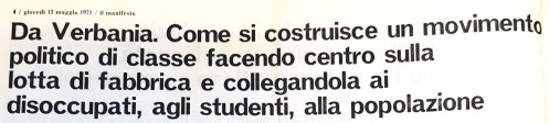 Lo sciopero generale deve diventare invece il momento di unificazione delle lotte in corso nelle varie fabbriche (Tubor, Unione manifatture, Rhodia, etc.) e del rilancio della lotta nelle altre. Rientrando da domani in fabbrica, bisogna impedire qualsiasi uso dello straordinario, tanto più che in molte fabbriche, come alla Cartiera prealpina l’uso esteso dello straordinario viene alternato a periodi dì cassa integrazione. Sì deve riprendere la lotta contro i carichi di lavoro, ritmi, il cottimo, usando dove è possibile, (come alla Tubor e alla Um) l’autolimitazione della produzione; rilanciare la riduzione dell’orario e l’azione contro la nocività. Alla Rhodia far partire finalmente la lotta per il premio di produzione, visto che da quasi un mese le assemblee di Verbania, Villadossola e Novara si sono pronunciate con decisione. Il movimento deve essere esteso alle zone circostanti, dove vanno a lavorare molti operai di Verbania (a Gravellona, a Omegna, in Svizzera).
