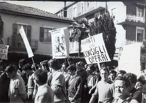 Ma ad un tratto l’inaspettato: mentre fuori si cerca lavoro, nei reparti della Rhodia parte la rivolta contro la organizzazione capitalistica del lavoro (carichi, ambiente, orario, qualifiche). Fino a tre anni fa il nome di Verbania ricordava il turismo lacustre, oggi significa lotta operaia. Dagli scioperi spontanei del giugno ’68 alla occupazione e alla vittoria del marzo ’69. La lotta contro l’organizzazione del lavoro crea nuovi posti di lavoro: oltre 400 posti in più alla Rhodiatoce. La lotta continua nei reparti per un anno e mezzo, crea nuove avanguardie, si estende ad altre fabbriche ed agii studenti.