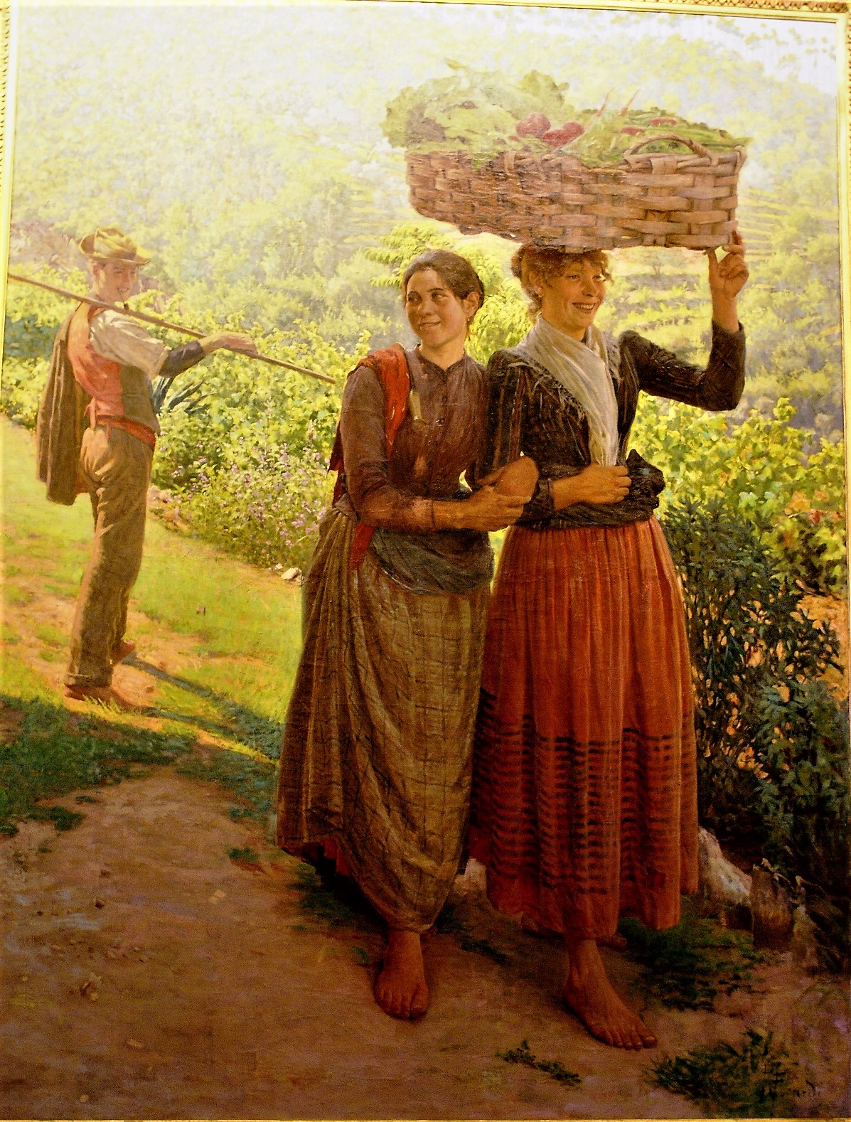 “Campigli rielabora il primitivismo in un linguaggio allo stesso tempo ingenuo e raffinato, infantile e colto. Come altri artisti dell’epoca, guarda all’arte del passato per trarne ispirazione e ad affascinarlo è soprattutto l’arte etrusca, scoperta nel 1928 in occasione di una visita al Museo di Villa Giulia, a Roma. Le figure femminili di questo quadro, con i loro corpi stilizzati ad anfora e la frontalità arcaica, ricordano quelle dell’arte funeraria etrusca, soprattutto nelle coppie con le braccia o le mani intrecciate. La tecnica, un olio magro dalla pasta densa, talvolta incisa come un graffito, richiama alla mente antichi affreschi parzialmente scrostati.”