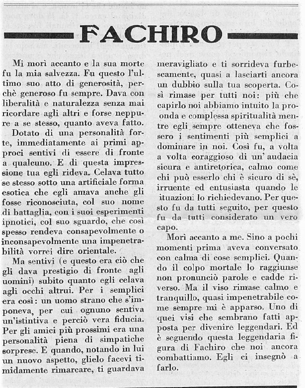 Lo spettacolo che stava per essere ammannito fu subito intuito dalla donna, alla quale ho accennato sopra. Costei si levò in piedi e con fare spontaneo, senza sforzare il tono della voce, direi quasi con amorevolezza, rivolta ai compagni di sciagura, pronunciò queste testuali parole: “Su, coraggio ragazzi, è giunto il plotone di esecuzione. Niente paura. Ricordatevi che è meglio morire da italiani che vivere da spie, da servitori dei tedeschi”. Aveva appena finito di parlare che, infuriato le fu addosso un soldato germanico, che doveva capire un poco di italiano e che del senso delle parole pronunciate, era stato messo al corrente da un militare italiano. (Quale schifo il contegno servile verso i padroni tedeschi dei militi fascisti! Non di tutti per fortuna, perché ne vidi più di uno fremere di rabbia, osservando ciò che di orribile si compieva intorno a lui). La donna fu colpita atrocemente da più di uno schiaffo e da uno sputo sul viso. Non si scompose; incassò impassibile, e poi fiera, e con aria inspirata, quasi trasumanata, disse parole che per mio conto, la rendono degna di essere paragonata a una donna spartana, o meglio ancora ad una eroina del nostro risorgimento: “Se percuotendomi volete mortificare il mio corpo, è superfluo il farlo: esso è già annientato. Se invece volete uccidere il mio spirito, vi dico che è opera vana: quello non lo domerete mai”. Poi rivolta ai compagni: “Ragazzi, viva l’Italia, viva la libertà per tutti!” Gridò con voce squillante.»