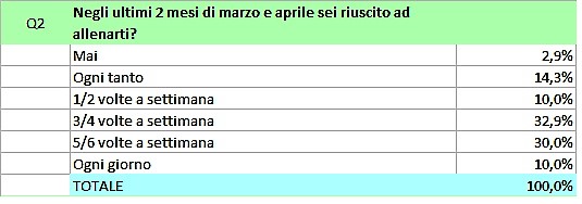 Come si può vedere dal raffronto fra maschi e femmine, mentre tra i primi solo una piccola minoranza non si è mai allenato e il 72,9% si è allenato almeno tre volte la settimana, tra le sportive il 20 % in questi due mesi non si è mai allenata e la percentuale di quelle che lo hanno fatto almeno tre volte la settimana scende al 60%.