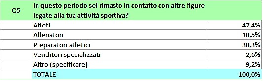 L’analisi delle risposte al questionario sopra riportata è volta a rendere leggibile e divulgabile quanto emerso dall’inchiesta. Non si escludono analisi più approfondite e magari confronti con indagini analoghe. Per questo forniamo di seguito, su foglio Excel, il report completo dei dati sia in valori assoluti che percentuali. Un ringraziamento a chi ci ha aiutato nella elaborazione e ai 96 atleti che hanno aderito a questo sondaggio.