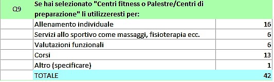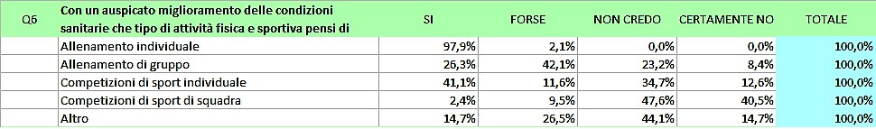 Quesito subordinato al precedente; in tabella i valori assoluti di chi pensa di ritornare ad utilizzare centri fitness e palestre: vengono prese in considerazione tutte le attività e servizi indicati, con prevalenza dell’allenamento individuale, ma non escludendo anche i corsi. In sostanza si può rilevare, come già nel quesito precedente una volontà di ritornare alla “normalità” e ad attività sperimentate. E magari di far tesoro anche di questo periodo di restrizioni non necessariamente negativo come emerge ad esempio in una risposta libera di una atleta che afferma di aver avuto occasione di scoprire alcune modalità di allenamento (indoor) utili anche successivamente.